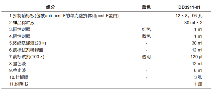 本试剂盒通过间接ELISA法,检测血清中抗post-F的IgG抗体:用抗post-F的单克隆抗体包被微孔板,利用固相抗体捕获post-F蛋白,形成捕获post-F蛋白的酶标板,加入阳、阴性对照及待测样本,当待测样本中存在post-F的IgG抗体时可与post-F蛋白结合。洗涤除去未结合的物质,加入可以特异性结合小鼠IgG抗体的酶标二抗,形成“包被抗体-抗原-抗体-酶标二抗”复合物,再次洗涤后,加入含有四甲基联苯胺(TMB)的显色液进行显色,最后加入终止液终止反应,在450 nm以及630 nm波长处读取OD值。样本的OD值与post-F的IgG抗体的量呈正相关。